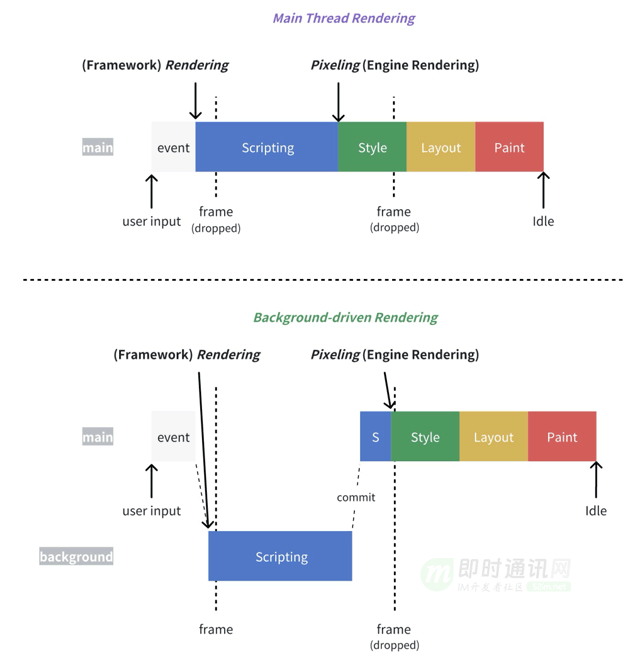 - 2)Lynx 的后台线程会运行完整的 React 运行时,处理的任务不直接影响屏幕像素的显示,包括在后台运行的脚本和任务(生命周期和其他副作用),它们与主线程分开运行,这样可以让主线程专注于处理用户交互和渲染,从而提升整体性能。