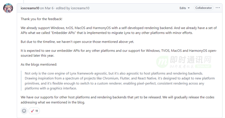 而在多平台上,Lynx 是自主开发的渲染后端支持 Windows、tvOS、MacOS 和 HarmonyOS ,但是不确实是否支持 Linux。