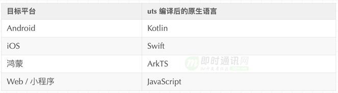 1)uts 和 ts 有相同的语法规范,并支持绝大部分 ES6 API ,在编译时会把内置的如Array、Date、JSON、Map、Math、String等内置对象转为 Kotlin、Swift、ArkTS 的对象等,所以也不需要有 uts 之类的虚拟机,另外 uts 编译器在处理特定平台时,还会调用相应平台的原生编译器,例如 Kotlin 编译器和 Swift 编译器。