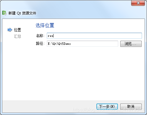 点击“选择…”按钮,打开“新建 Qt 资源文件”对话框。在这里我们输入资源文件的名字和路径: