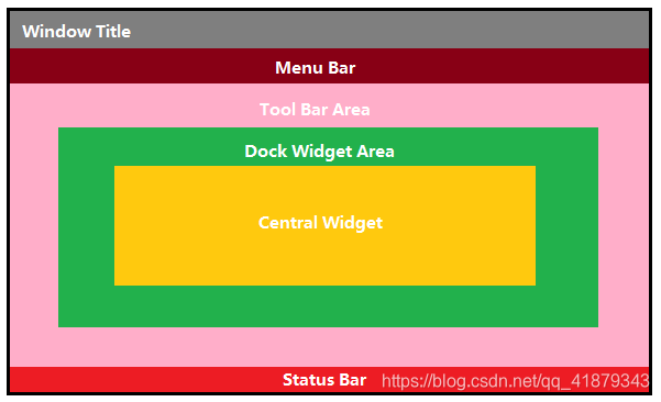 QMainWindow是一个为用户提供主窗口程序的类,包含一个菜单栏(menu bar)、多个工具栏(tool bars)、多个锚接部件(dock widgets)、一个状态栏(status bar)及一个中心部件(central widget),是许多应用程序的基础,如文本编辑器,图片编辑器等。