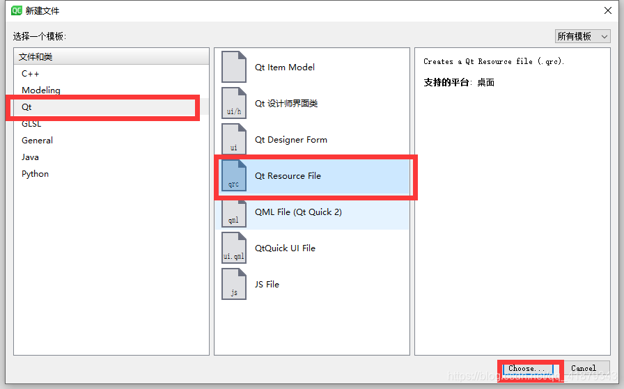 使用 Qt Creator 可以很方便地创建资源文件。我们可以在工程上点右键,选择“添加新文件…”,可以在 Qt 分类下找到“Qt 资源文件”: