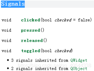 那么系统自带的信号和槽通常如何查找呢,这个就需要利用帮助文档了,在帮助文档中比如我们上面的按钮的点击信号,在帮助文档中输入QPushButton,首先我们可以在Contents中寻找关键字 signals,信号的意思,但是我们发现并没有找到,这时候我们应该想到也许这个信号的被父类继承下来的,因此我们去他的父类QAbstractButton中就可以找到该关键字,点击signals索引到系统自带的信号有如下几个
