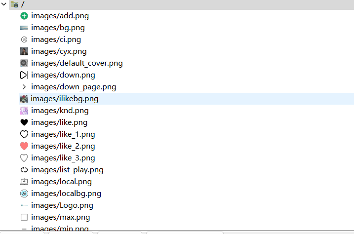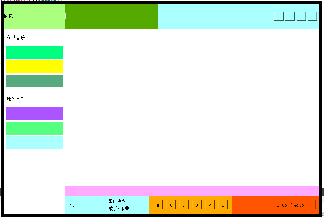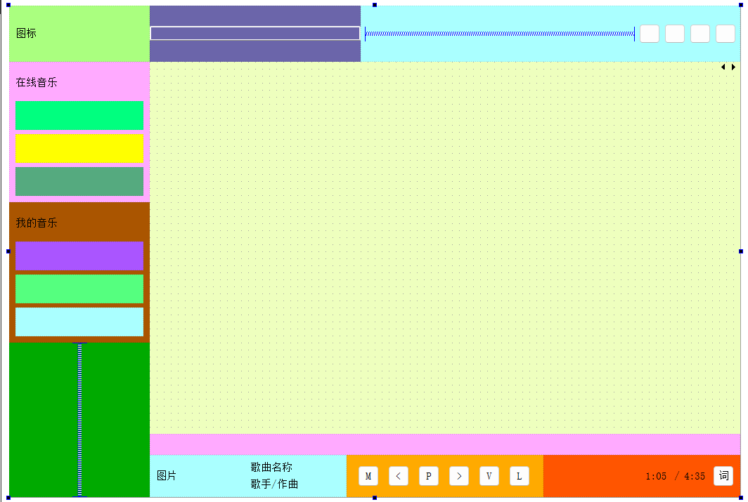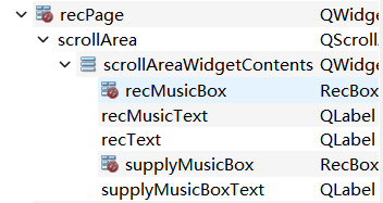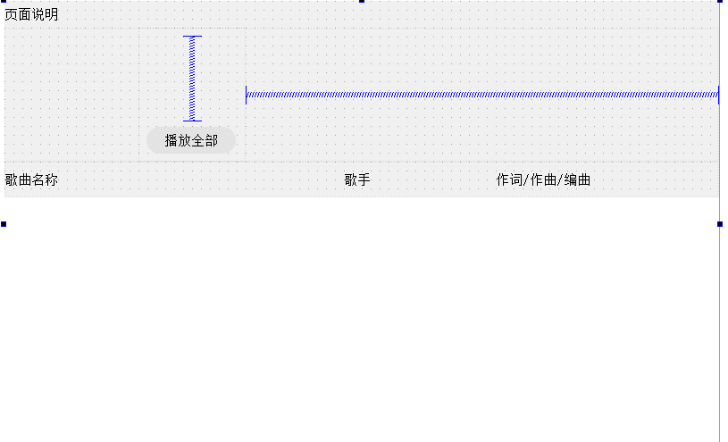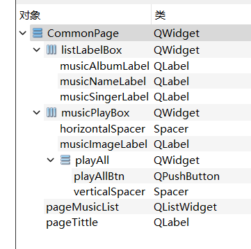 此页面的布局很简单,一行文本用来标记当前页的作用,一张图片和前者类似,然后一个全部播放按钮,下面是一个ListWidget用来存放音乐曲目,大致布局如下: