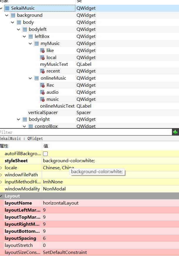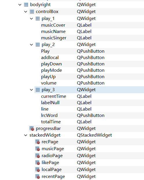 注意到上图的进度条部分了吗,它看起来已经能说的过去了,实现也很简单(当然我们现在只是吧界面的显示部分给弄好,其他逻辑到我们真正导入音乐之后才能开始着手),MusicSlider的样式与控件从属关系如下: