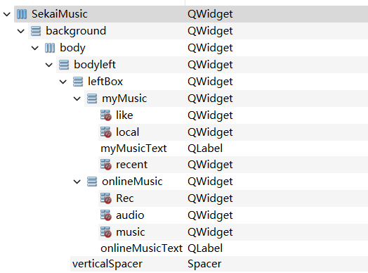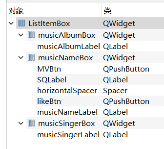 我们来认识下这个结构,从左向右一共是三个QLabel,第一个Label用来标识音乐名,我喜欢按钮,以及是否有高级音质SQ,是否有MV.接下来后面两个里面都是QLabel.这明显不是原ListWidget能支持的列表控件,所以我们可以这样布局该自定义控件:
