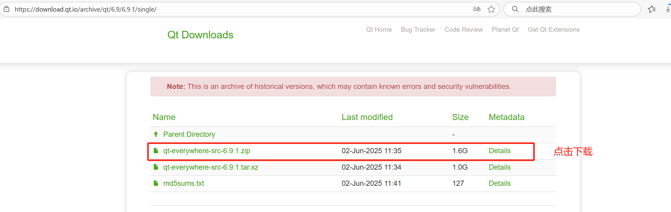 进入single目录,点击qt-everywhere-src-6.9.1.zip进行下载。