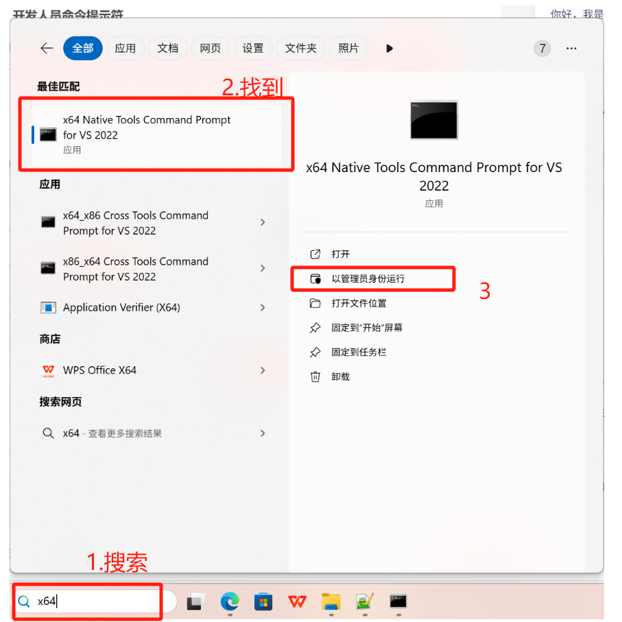 Win + S搜索 x64,找到"x64 Native Tools Command Prompt for VS 2022"(x64的电脑就选这个,x86的就选"Developer Command Prompt for VS 2022",别搞错了,否则会遇到后面的问题模块计算机类型“x86”与目标计算机类型“x64”冲突),右键选择 "以管理员身份运行"(避免权限问题)。