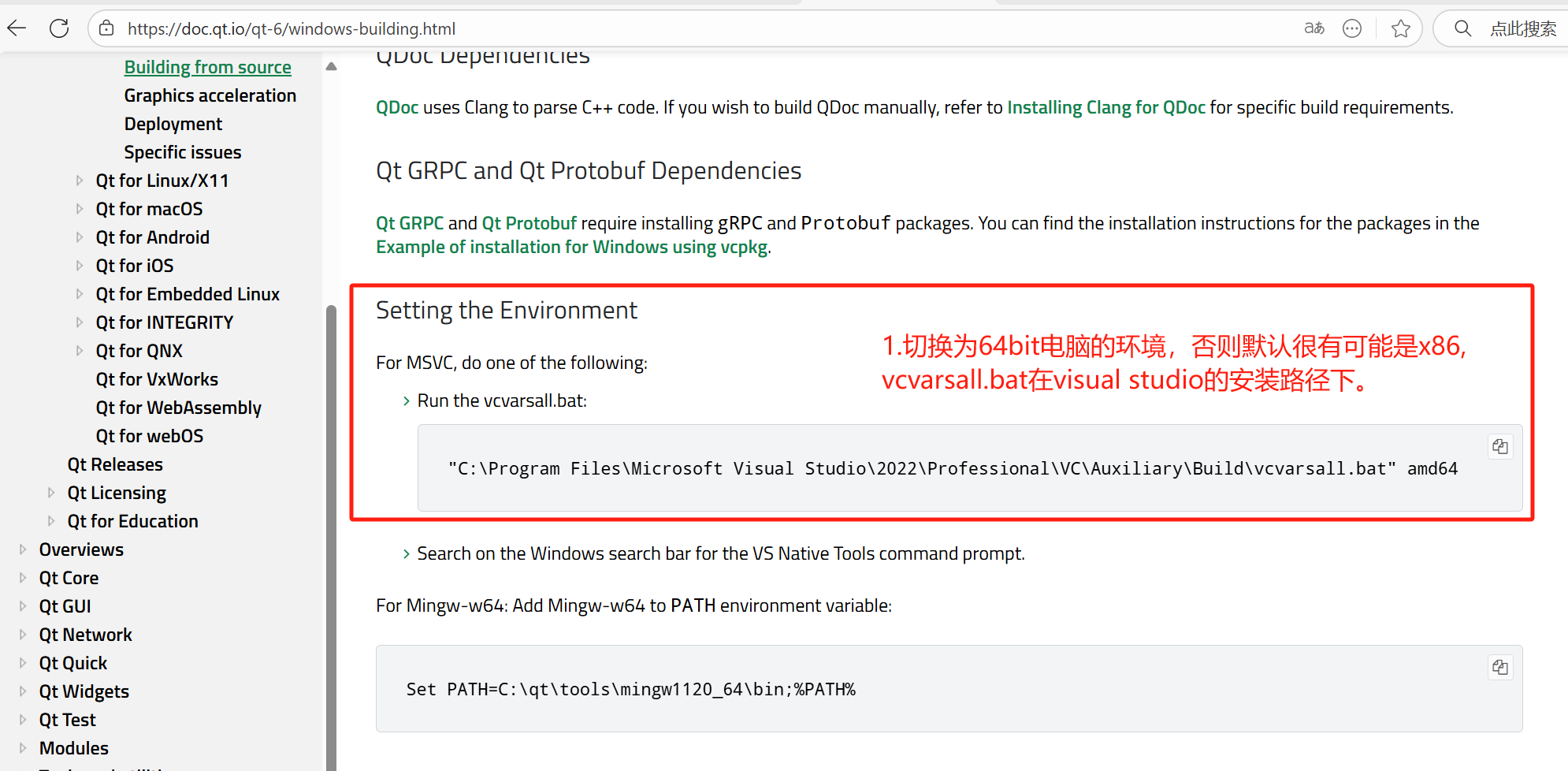 出现了这个问题后,才知道Visual Studio 2022中配的是x86的编译器,原因如上提及到的,我使用的是Developer Command Prompt for VS 2022指令窗口而不是x64 Native Tools Command Prompt for VS 2022指令窗口,QT手册中也有配置环境的提醒,但是我没有留意,耽误了很长时间,不过一开始也不知道这个是干啥的,在弯路中成长也不错。