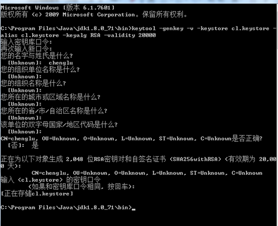 keytool -genkey -v -keystore cl.keystore -alias cl.keystore -keyalg RSA -validity 20000