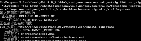 jarsigner -verbose -digestalg SHA1 -sigalg MD5withRSA -tsa http://sha256timestamp.ws.symantec.com/sha256/timestamp -keystore cl.keystore -signedjar icl.apk android-release-unsigned.apk cl.keystore