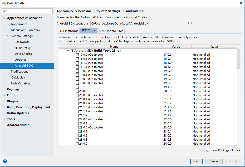 然后点击"SDK Tools"选项卡,同样勾中右下角的"Show Package Details"。展开"Android SDK Build-Tools"选项,