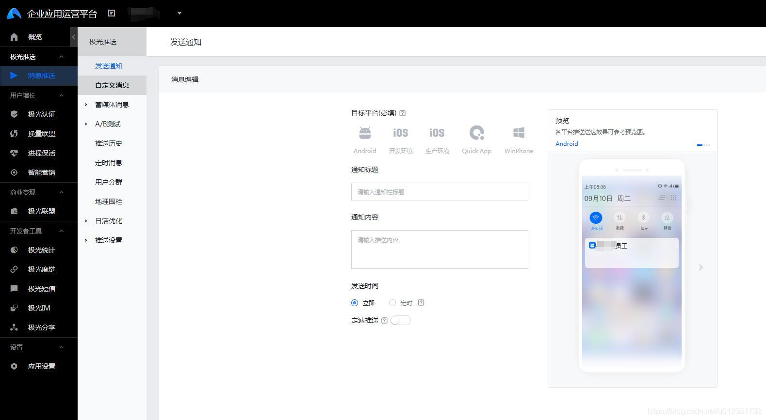 3.1 登录极光企业运营平台 https://www.jiguang.cn/jpush2/#/app/86a12bbd9a265851637d3c5b/push_form/notification