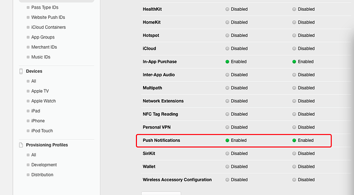 - 开发环境和发布环境PP文件(Provision profiles)这里要说明以下为什么在配置文件里不见选择推送证书的选项,是因为我们在配置APP ID的时候已经绑定了推送证书,而在配置文件里又绑定了APP ID,所以就等于已经通过APP ID绑定了推送证书了