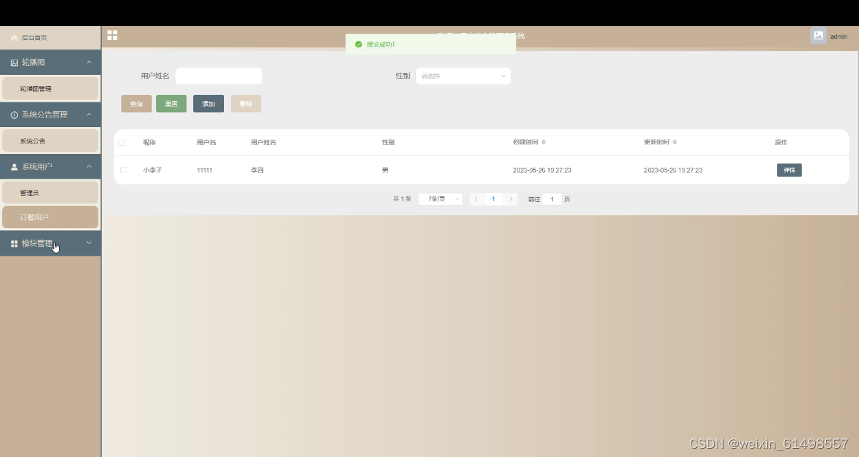 系统用户管理,在此页面中可以查看用户的详细信息,包括昵称,用户名,用户姓名,性别等信息,还可在此页面进行添加、删除或重置等操作,如下图所示。