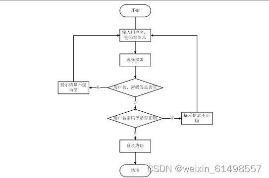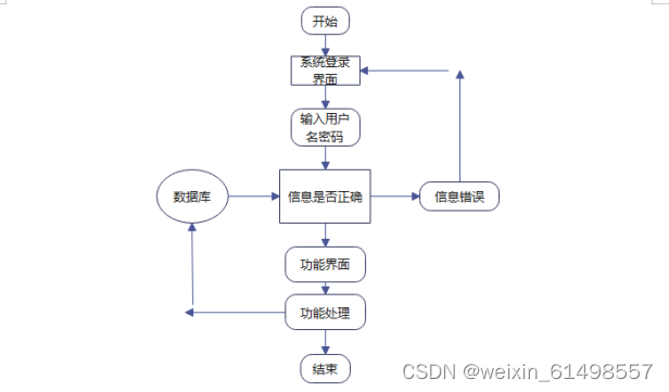 用户打开并进入系统后,会先显示登录界面,输入正确的用户名和密码,系统自动检测信息,若信息无误,则用户会进入系统功能界面,进行操作,否则会提示错误无法登录,操作流程如图3-6所示。