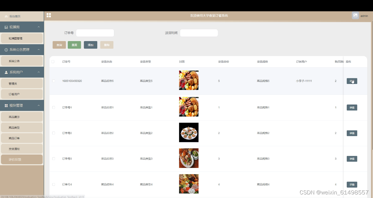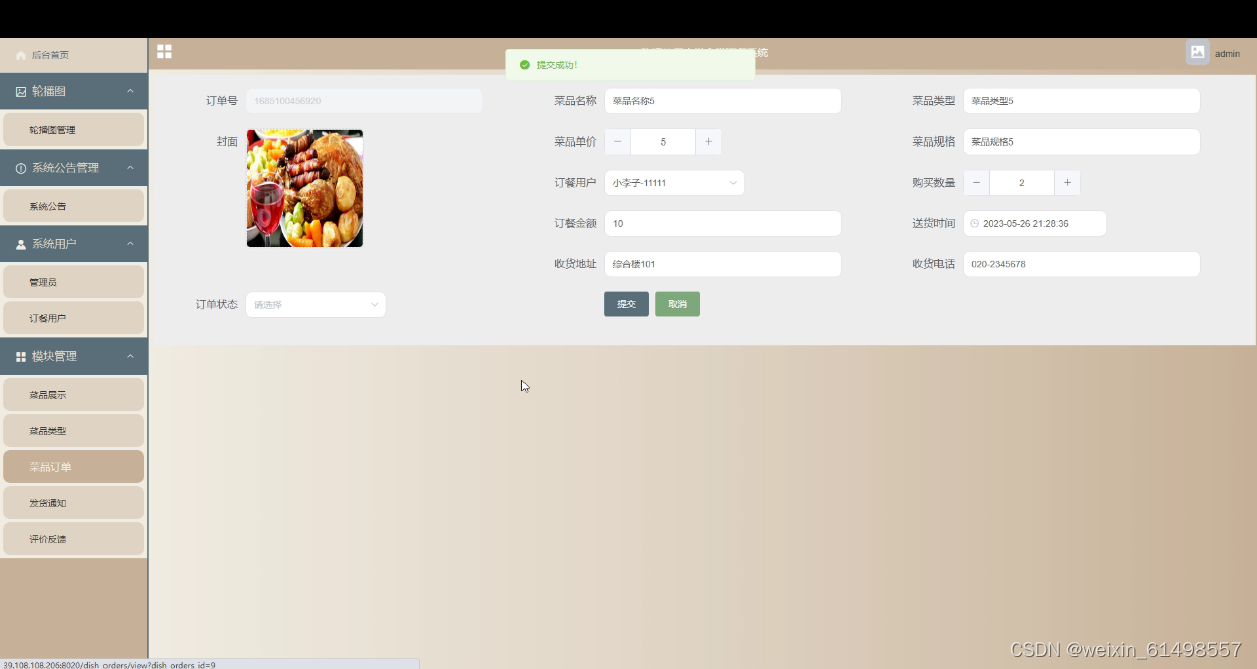 菜品订单,在此页面中可以查看用户提交的订单的详细信息,包括订单号,菜品名称,菜品类型,封图,菜品单价,菜品规格,订餐用户,购买数量,订餐金额,送货时间,收货地址,收货电话,订单状态等信息,还可在此页面进行添加、删除、重置、发货等操作,如下图所示。