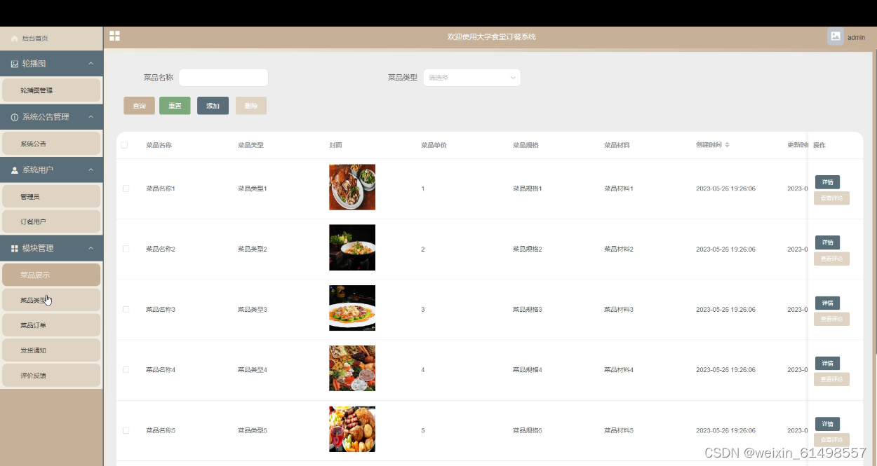 大学食堂订餐系统APP的主要使用者分为管理员和订餐用户,实现功能包括:首页,轮播图管理,系统公告管理,系统用户(管理员,订餐用户),模块管理(菜品展示,菜品类型,菜品订单,发货通知,评价反馈)等功能。由于本网站的功能模块设计比较全面,所以使得整个大学食堂订餐系统APP信息管理的过程得以实现。