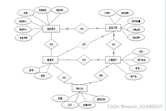 本大学食堂订餐系统APP采用的是MYSQL数据库,数据存储快,因为大学食堂订餐系统APP,主要的就是对信息的管理,信息内容比较多,这就需要好好的设计一个好的数据库,分类要清楚,不能添加信息的时候,造成信息太过混乱,设计好的数据库首先就需要先把各个实体之间的关系表达明确,系统的E-R图如下图所示: