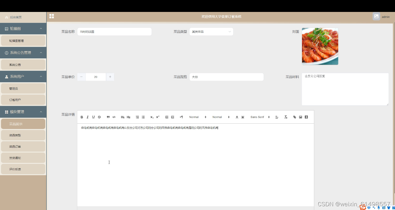 菜品展示管理,在此页面中可以查看菜品的详细信息,包括菜品名称,菜品类型,封图,菜品单价,菜品规格,菜品材料,菜品详情等信息,还可在此页面进行添加、删除或重置等操作,如下图所示。