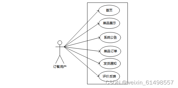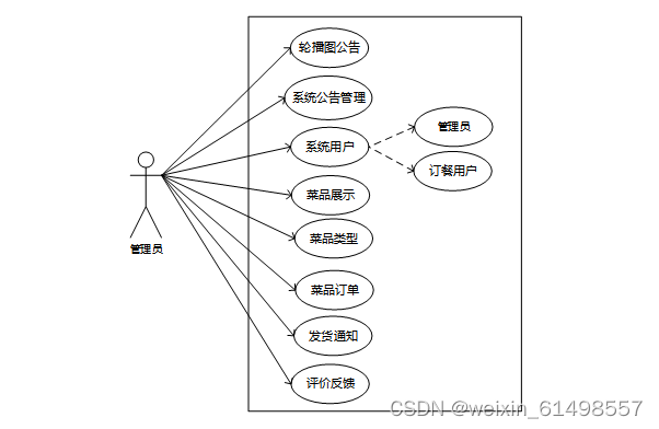 (1)管理员模块:系统中的核心系统用户是系统管理员,管理员登录后,通过管理员菜单来管理后台系统。主要功能有:后台首页,轮播图管理,系统公告管理,系统用户(管理员,订餐用户),模块管理(菜品展示,菜品类型,菜品订单,发货通知,评价反馈)等。管理员用例图如图3-1所示。