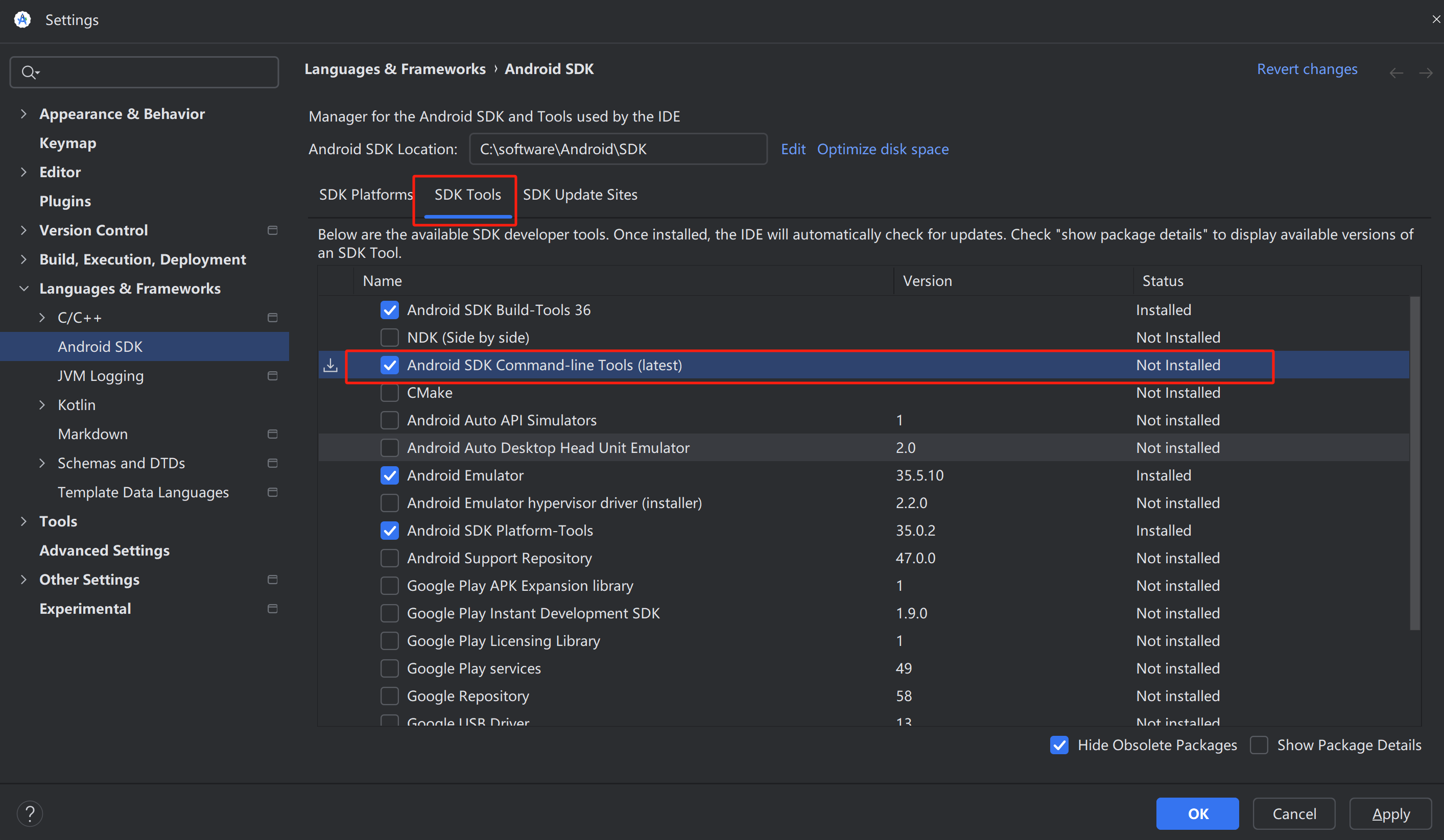 安装完 SDK 后,再进入 SDK 工具选项,安装 Command-line Tools 命令行工具,之后在电脑上运行安卓 apk 包时可能会用到: