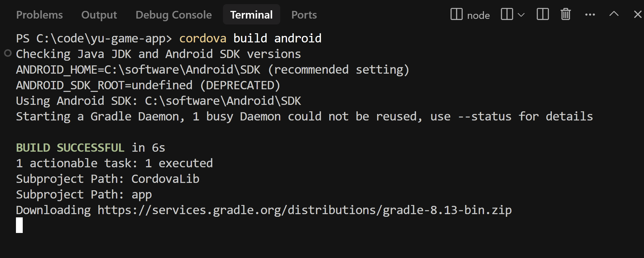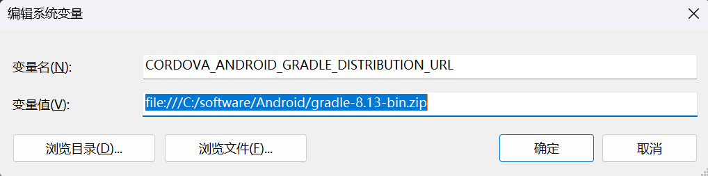 这时,我们可以配置环境变量 CORDOVA_ANDROID_GRADLE_DISTRIBUTION_URL,指定从本地下载 Gradle。环境变量的值设置为我们自己下载的 Gradle 压缩包的路径。