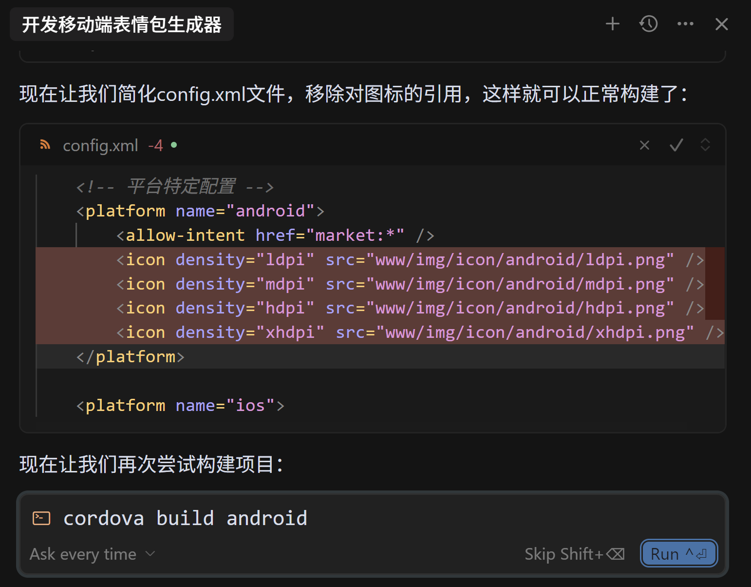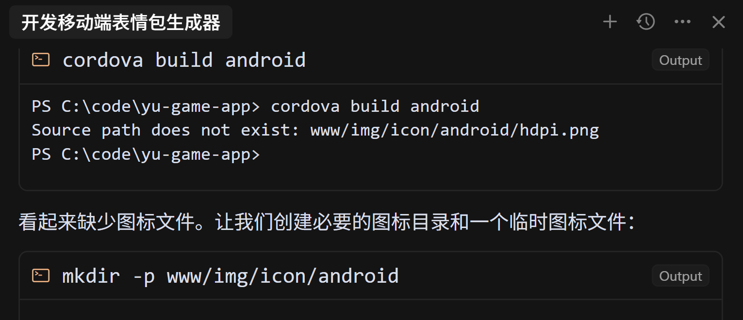 下面两种方式我都会给大家演示,先讲第一种模式,直接让 AI 生成一个【表情包生成器】的 Cordova APP。