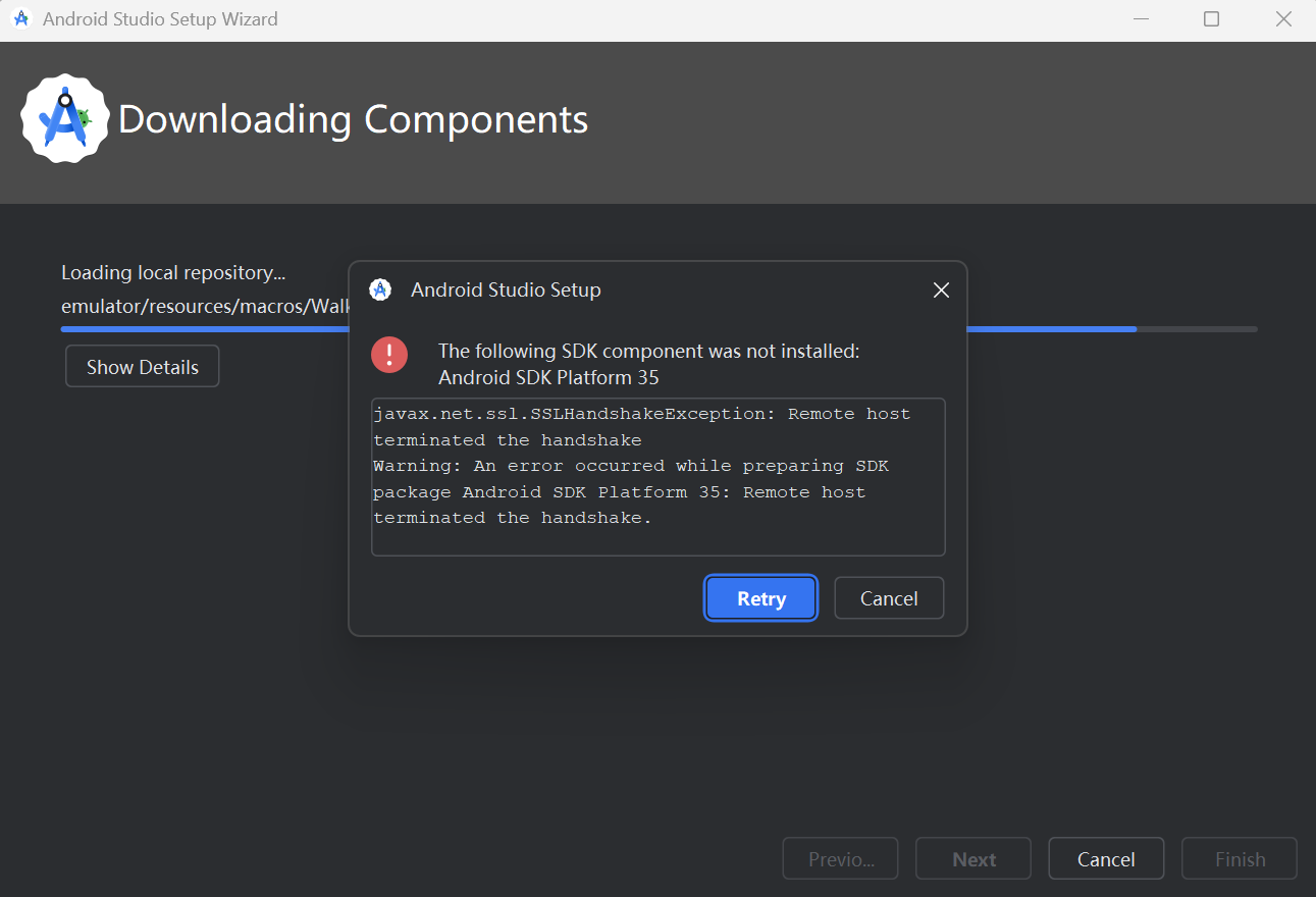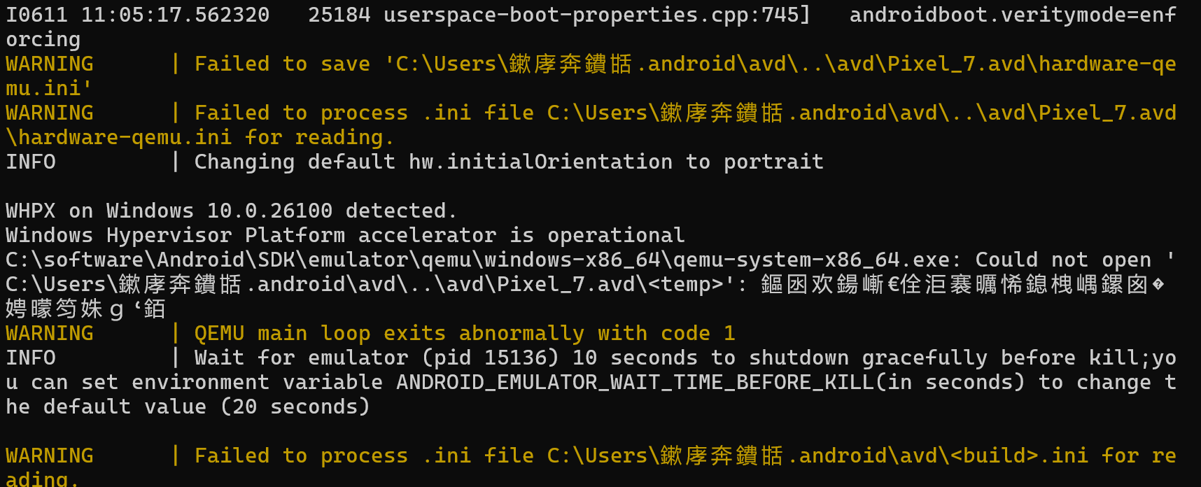 如果你也遇到这种情况,可以在终端 进入 Android 模拟器目录 手动运行虚拟设备,这样能够看到详细的错误信息,有利于排查问题。