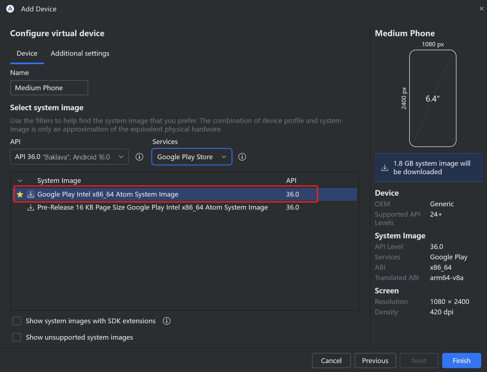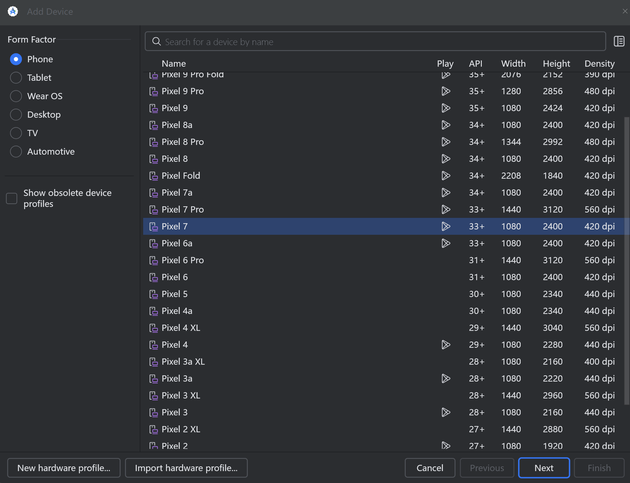 选择指定机型,建议选择 API 版本高一点的,我这里选择 Pixel 7: