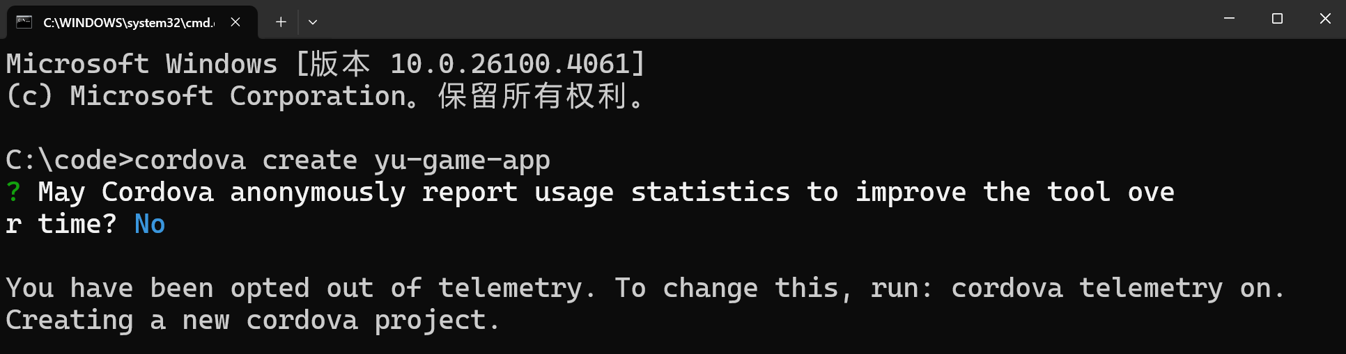 打开终端,进入你想要创建项目的目录,先执行 cordova create 命令来创建项目: