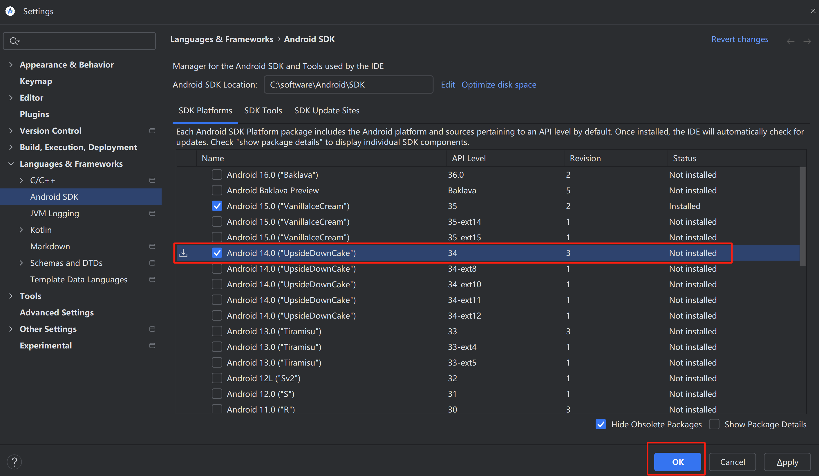 配置完成后,我们打开 Android Studio,右上角进入 SDK Manager 的设置,根据 Cordova 的版本号要求,安装对应 API Level 的 SDK,比如我这里安装了 34 和 35 版本。