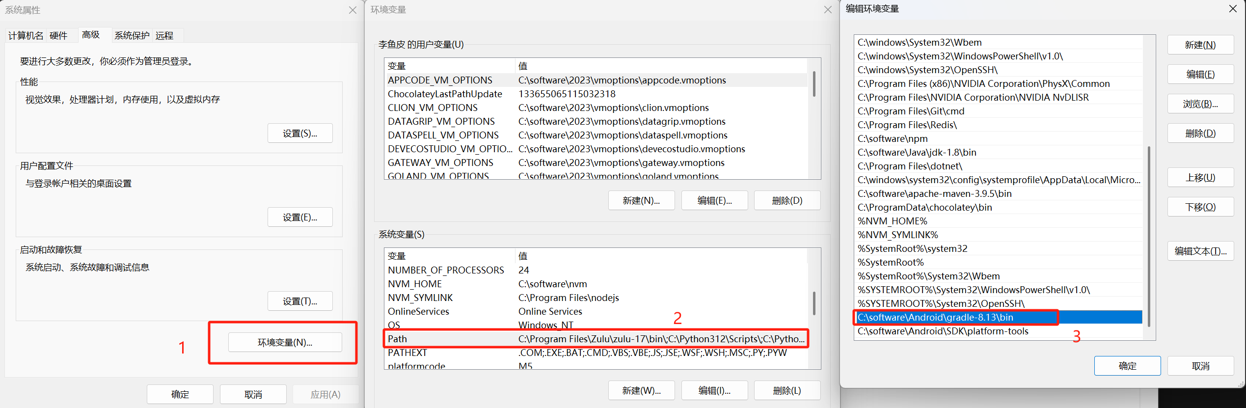 解压下载完成的压缩包,移动到 不包含中文的路径 中,然后配置环境变量,包括 Path 和 GRADLE_HOME: