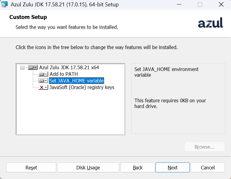 安装 Java 时建议选择 自动配置环境变量(包括 Path 和 JAVA_HOME),就不用自己手动配置环境变量了。