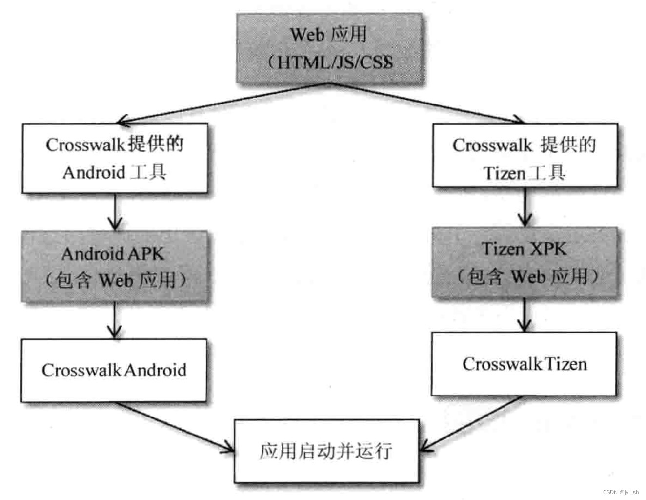 - 满足Android系统只能从Application和Activity类来启动,而不是Web应用。为此,Crosswalk项目提供了一些代码来让Android系统启动Crosswalk运行平台,而该运行平台根据Web应用的设置来启动Web应用。