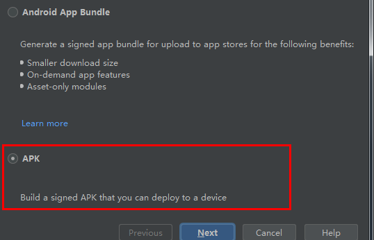 在Android Studio中,Build->Generate Signed Bundle/APKAndroid App Bundle是发布到Google App Store使用,要选择下面APK