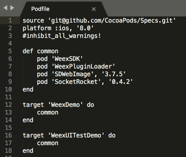 好了,接下来用pod命令对这些依赖进行安装,cd到ios目录,pod install就可以了,前提是要先安装好cocoaPods,ios开发对它都比较熟悉,这个网上有很多教程。还有如果pod库很久没有更新的话很可能会安装失败,因为找不到上图中新版本的weex相关的库,建义pod setup,pod update更新一下库。这个最好翻-墙操作,否则会等很久。如果之前更新过pod,那使用 pod install --no-repo-update 安装会更快。安装好后如下: