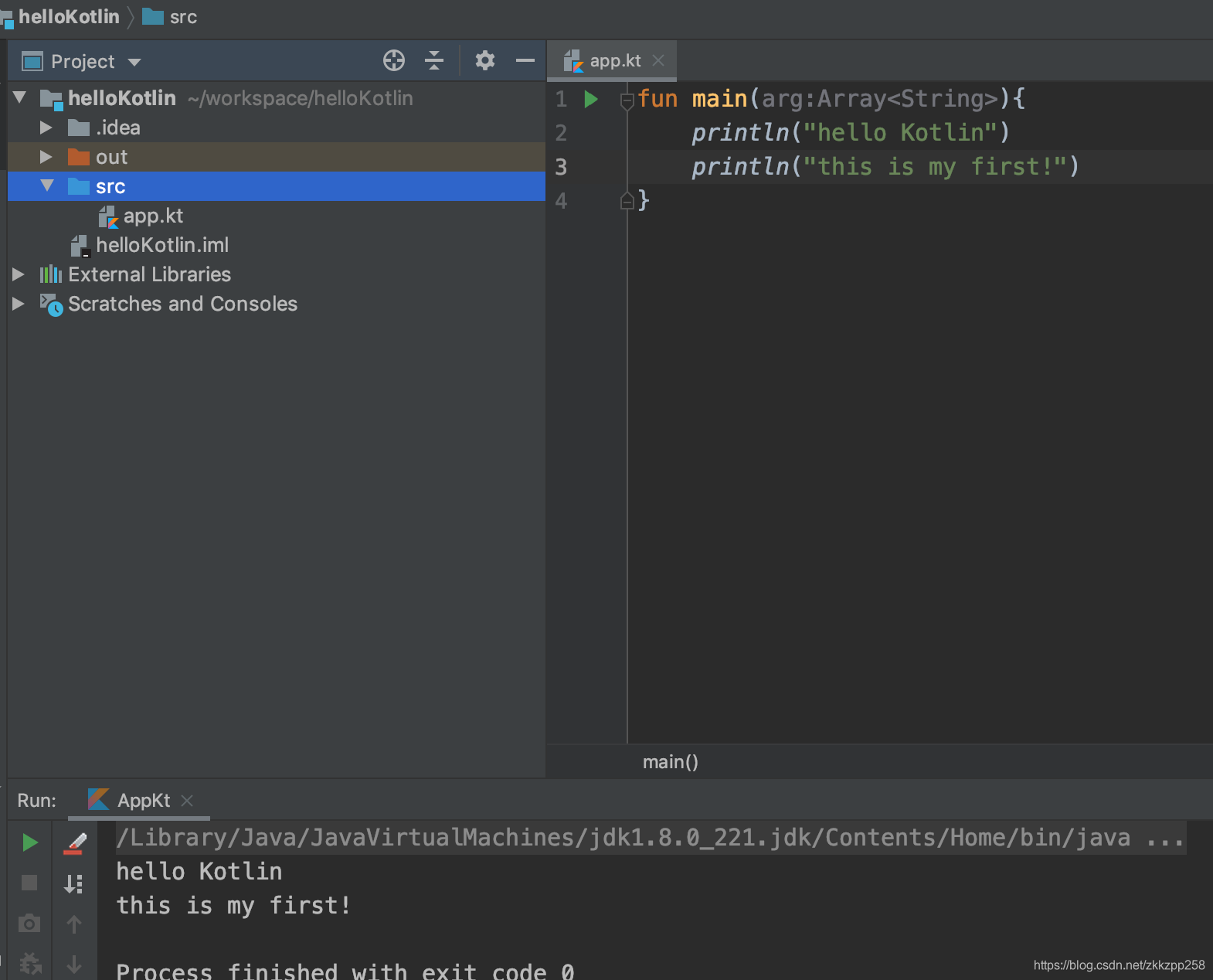 按照IDEA环境搭建创建Kotlin工程,在src目录下创建一个app.kt文件跑出第一个函数。