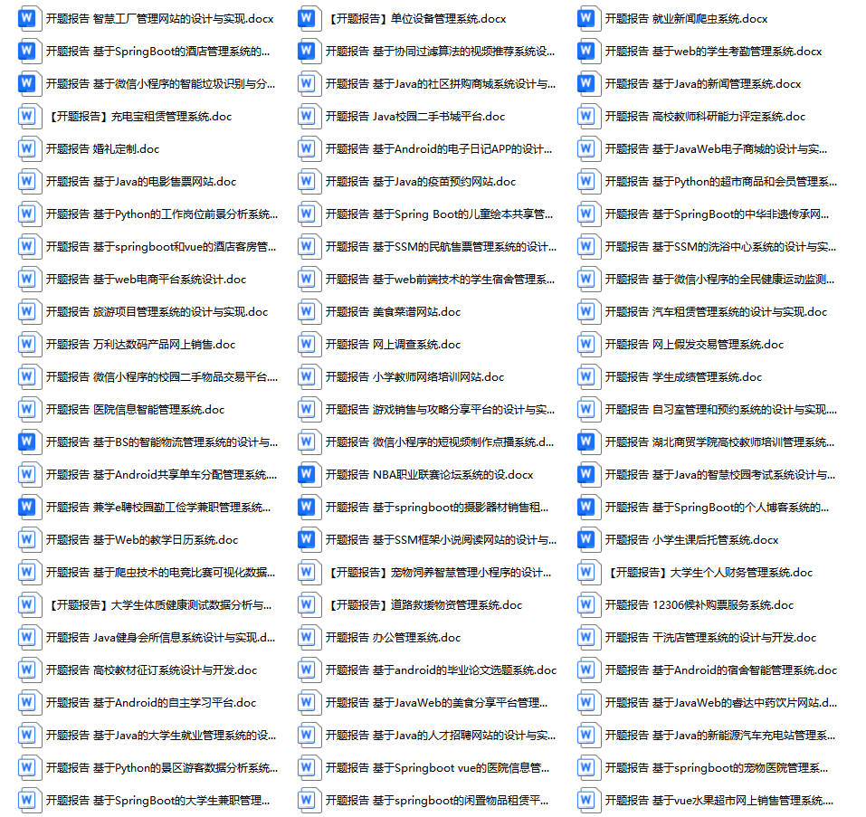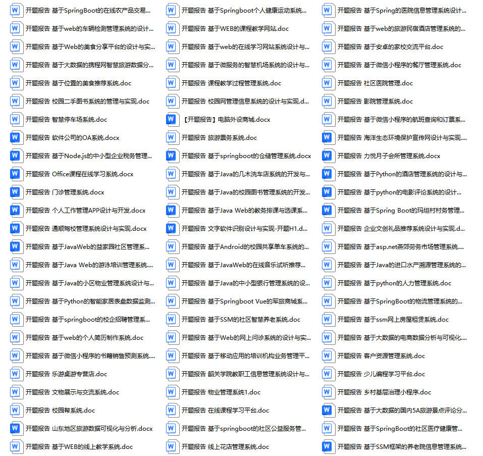 以上是某同学的毕业设计答辩的过程,如果你现在还没有参加答辩,还是开题阶段,已经选好了题目不知道怎么写开题报告,可以下面找找有没有自己符合自己题目的开题报告内容,列表中的开题报告都是往届真实的开题报告,可发送使用或参考。文末或底部来联xi可免费获取