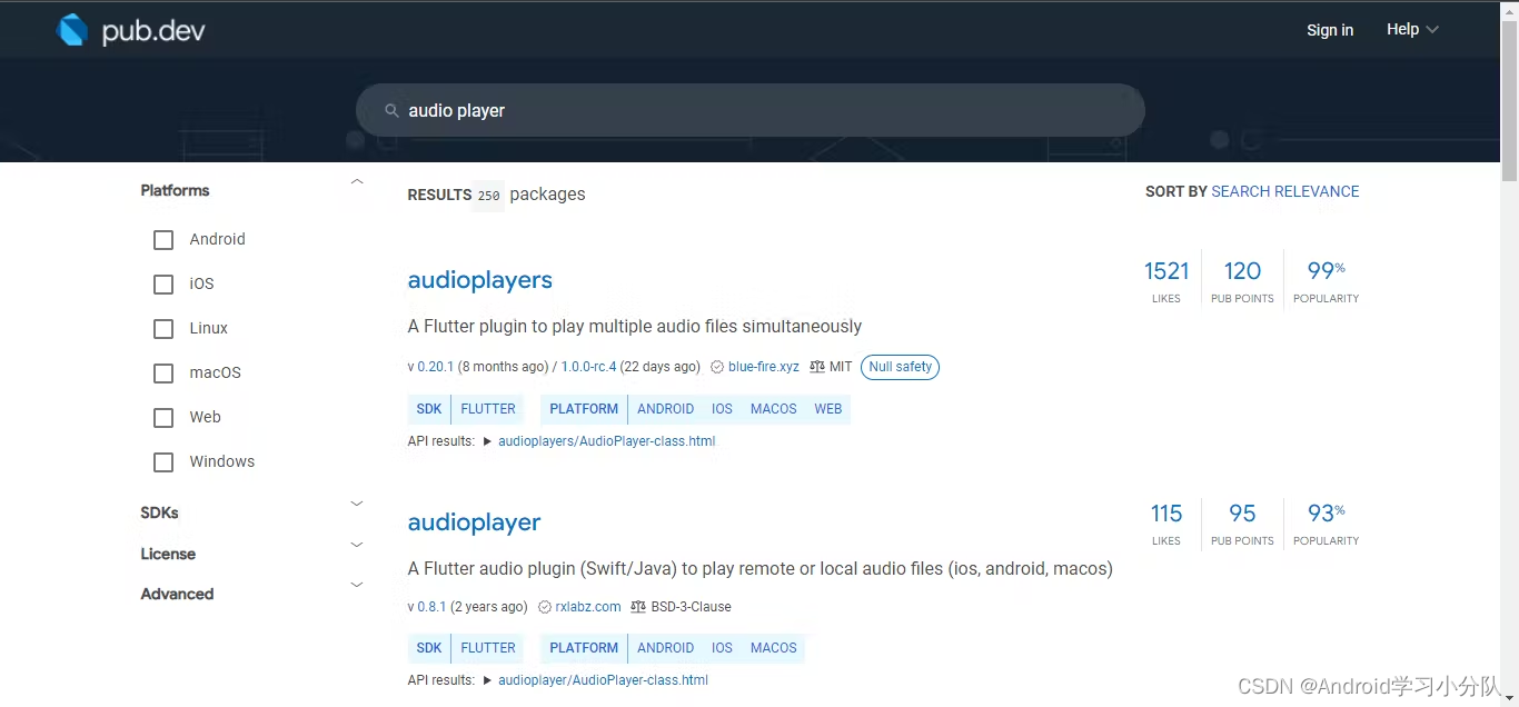 在网站上,我不得不搜索音频播放器的包名称。选择包时,您必须查看不同的指标,例如名称、人气分数、喜欢以及发布时间。使用所有这些将使您选择一个好的包来开发您的应用程序。
