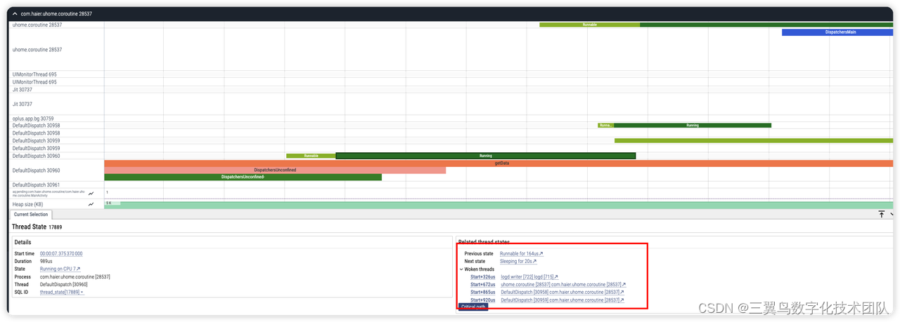 如图所示,子线程 30960 会在合适的位置唤醒包括主线程在内的其他线程,达到了线程切换,顺序执行,又不会 block 导致 anr 的目的。