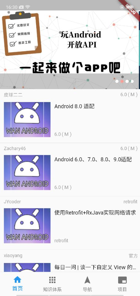 一个简单Flutter项目wanandroid,先前用Kotlin来开发过,适合新手练习。用到的库包含功能: http+数据解析 网络请求数据列表展示 Banner轮播 WebView跳转详情 Drawer侧滑个人中心 TabLayout ......效果图:源码下载:https://...