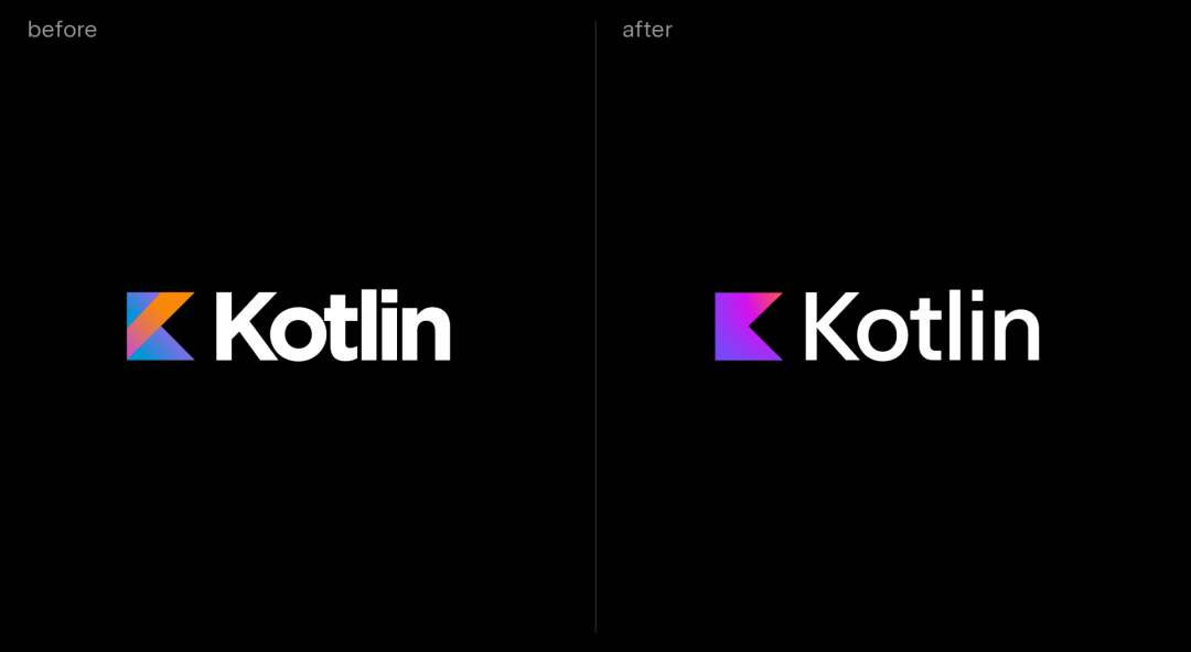 颜色是变化最明显的地方,Kotlin 团队表示,旧 Logo 的颜色感觉已经过时,它给人的整体印象与 Kotlin 的现代性和不断发展的特点并不匹配。另外,旧 Logo 中的条纹虽然有助于突出 Kotlin,并且具有辨识度,但它不是一个非常独特的外观,因此团队也决定将其删除。去掉条纹、将旧 Logo 的颜色融合在一起形成具备渐变效果的新颜色,使其更加明亮和鲜艳,这就是新 Logo 的特点。
