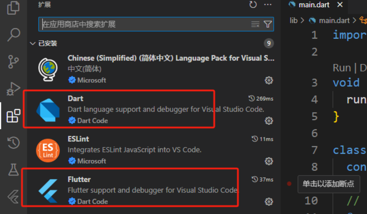 安装 Flutter 和 dart 插件,这样后续敲代码便有了一些快捷提示。