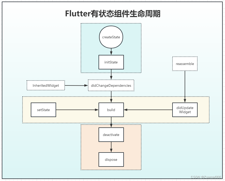 1. 初始化阶段,包括两个生命周期函数 createState 和 initState;