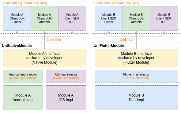 - 自动代码生成: 借助强大的代码生成引擎,Unify 可以自动生成 Flutter、Android、iOS 多平台下统一调用的 SDK。