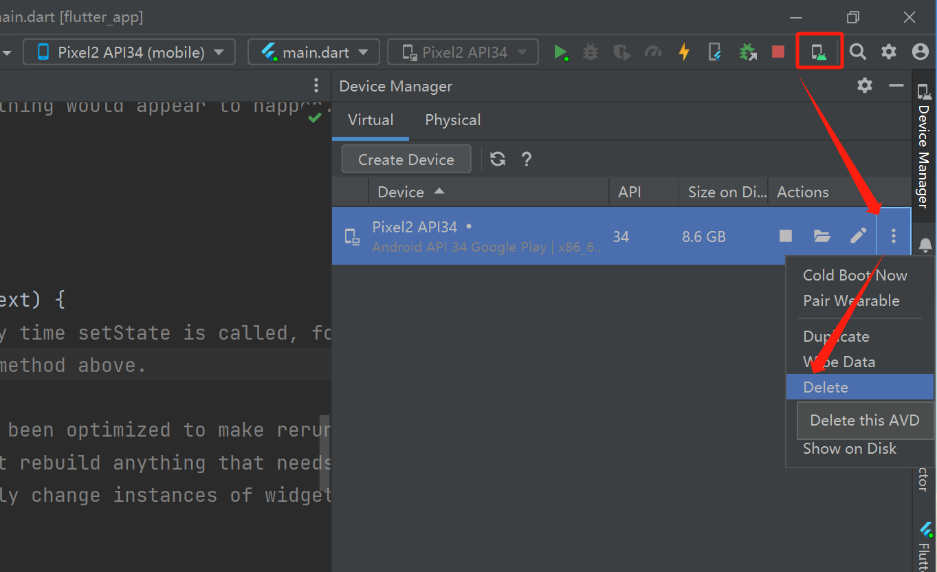 然后点击一下安卓模拟器,先删掉android studio自带的模拟器,再冲洗创建一个,不知道什么原因,自带的那个启动总是失败,无法正常使用:模拟器必须是停止状态,才可以删除