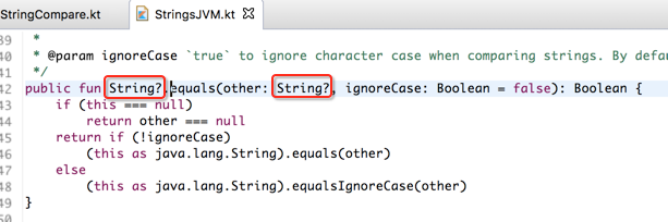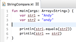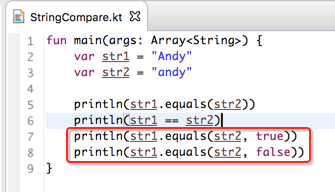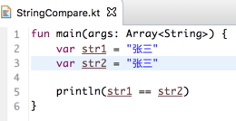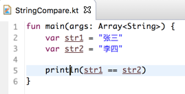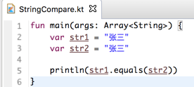 所以在kotlin中的字符串的==其实跟equals效果一样,下面改成equals: