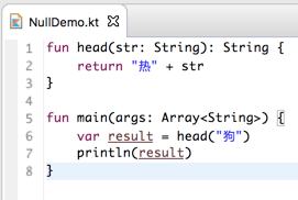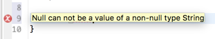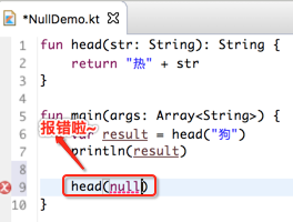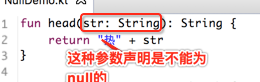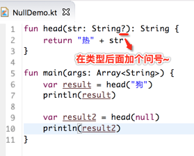 这点比java要强呀,在实际项目中上线之后出现空指针异常比比皆是,基本上每个程序员都无一幸免,但是想一下,有了kotlin这种机制直接就把空指针的可能性在编译期就可扼杀了,是不是kotlin要比java人性呢?哈哈,先不过多对新语言做评论,因为还是小白还木有发言权,回到正题,那如果要能将参数支持传null该如何处理呢?