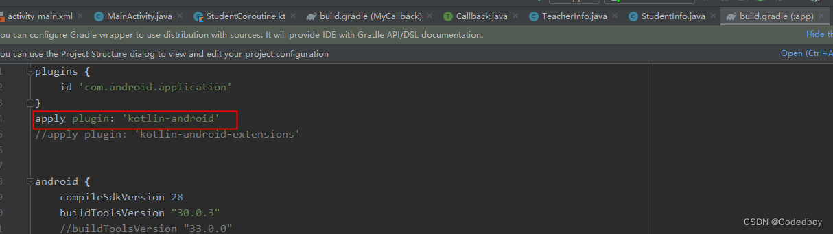 在app级build.gradle中添加kotlin plug引入。没有添加kotlin的plug引入。然后再在程序级build.gradle中添加kotlin plug扩展依赖库。(2)但是在activity中创建一个该StudentCoroutine后,编译运行时会出现上文图片的错误。在android用kotlin开发过程中,明明已经定义过一个类了,但是在编译运行时会发生如下图片的错误。
